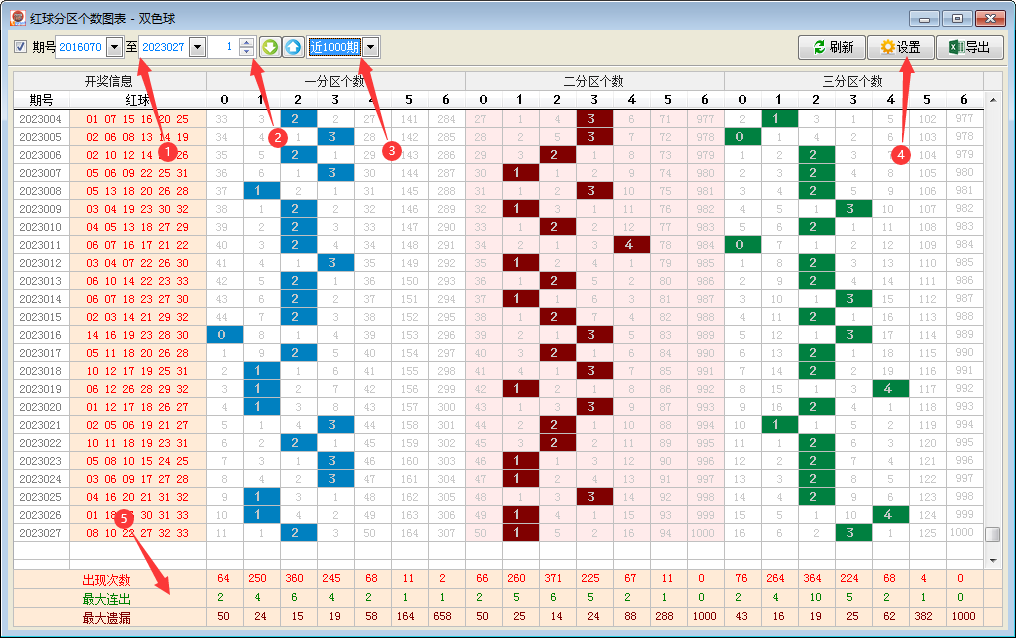 通过分区个数图表可以对每个分区的出号数量进行一个判断,通常每个分区的出号个数在1-3之间波动,具体组号时可以设对应分区出现1-3个即可,该功能界面如下: