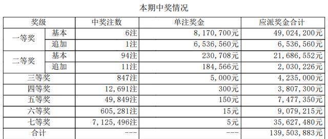本期一等奖出自:辽宁(基本1注)、黑龙江(基本1注)、江苏(基本1注)、福建(基本1注)、山东(基本1注)、海南(基本1注 追加1注),单注最高奖金1470万。