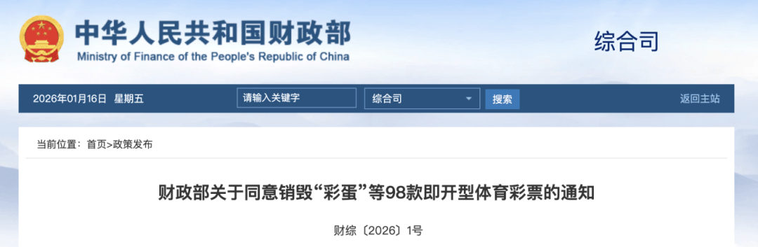1月13日,财政部发布了关于同意销毁“彩蛋”等98款即开型体育彩票的通知。要求国家体彩中心严格执行彩票销毁相关规定,在国家体育总局的监督下,选择符合要求的销毁地点,及时组织开展销毁工作。发现问题的,应当立即停止销毁,查明原因并处置后再行销毁。销毁工作应在通知印发之日起30个工作日内完成,在销毁工作完成之后20个工作日内向财政部报送销毁情况报告。